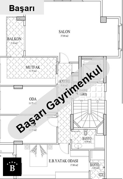 Başarı'dan hamam sokakta katta tek 116m2 net 3+1 balkonlu sifir