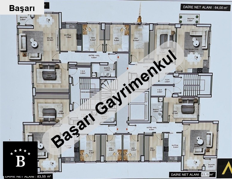 Başarı'dan 19 mayis mh konumda balkonlu aydinlik 83 m² net 3+1