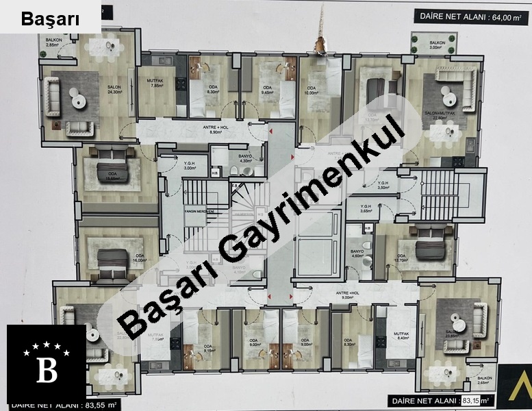 Başarı'dan 19 mayis mh konumda balkonlu aydinlik 85 m² net 3+1